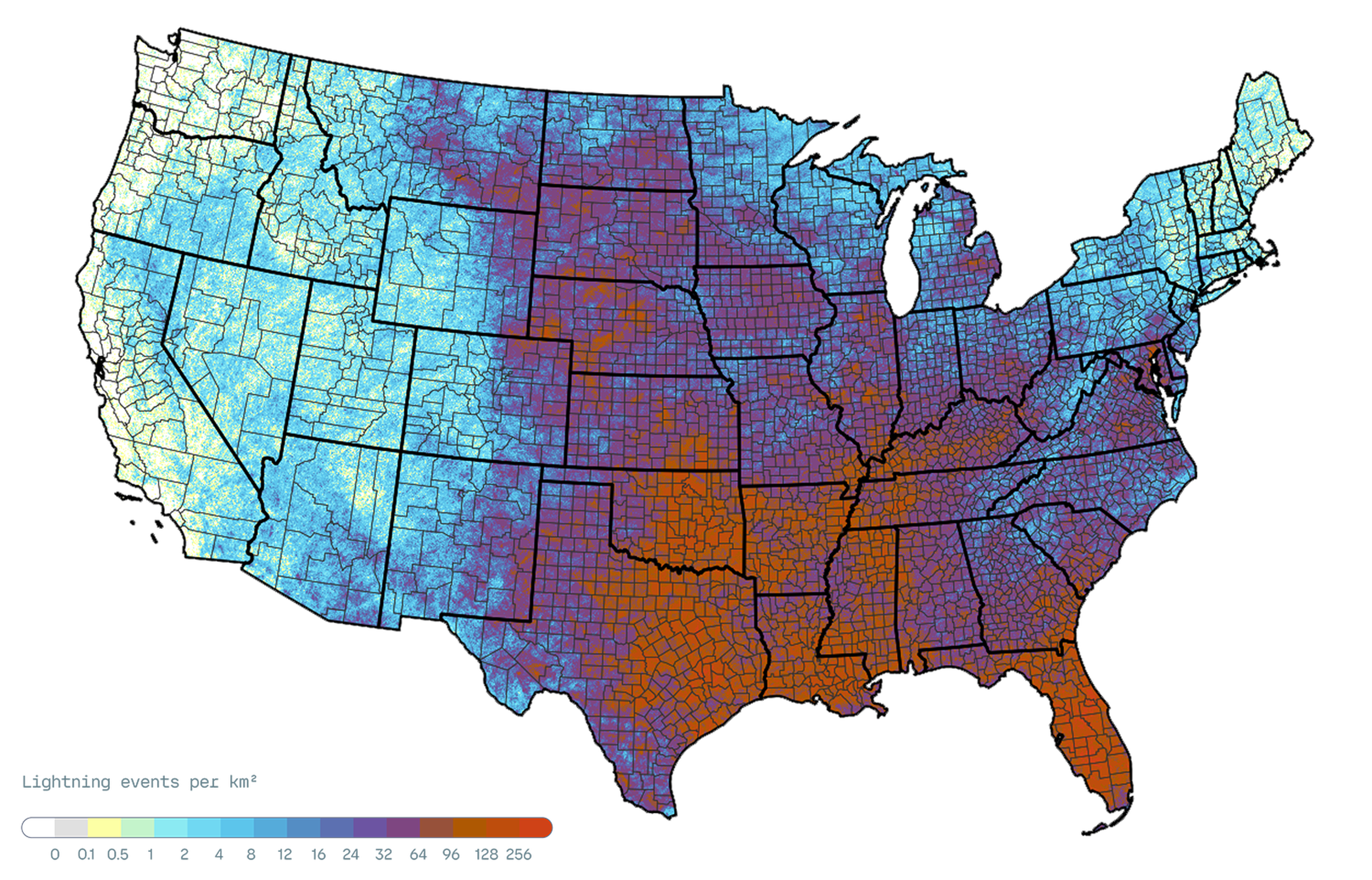 Lightning density tells us how many lightning events occurred per square kilometer of area. Calculating lightning density allows us to compare lightning activity across regions of different sizes, such as countries, states, or counties.