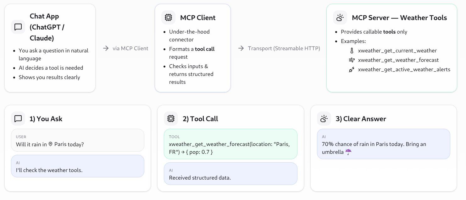 These examples reflect a key point in that models don’t respond to constantly changing weather conditions independently. If you built your own model, you could decide to retrain it. However, retraining doesn’t give it awareness of current conditions. The Xweather’s MCP server is the bridge to this approach to weather data, giving agents a structured way to access forecasts, alerts, and historical records through a single interface. Let’s take a closer look.