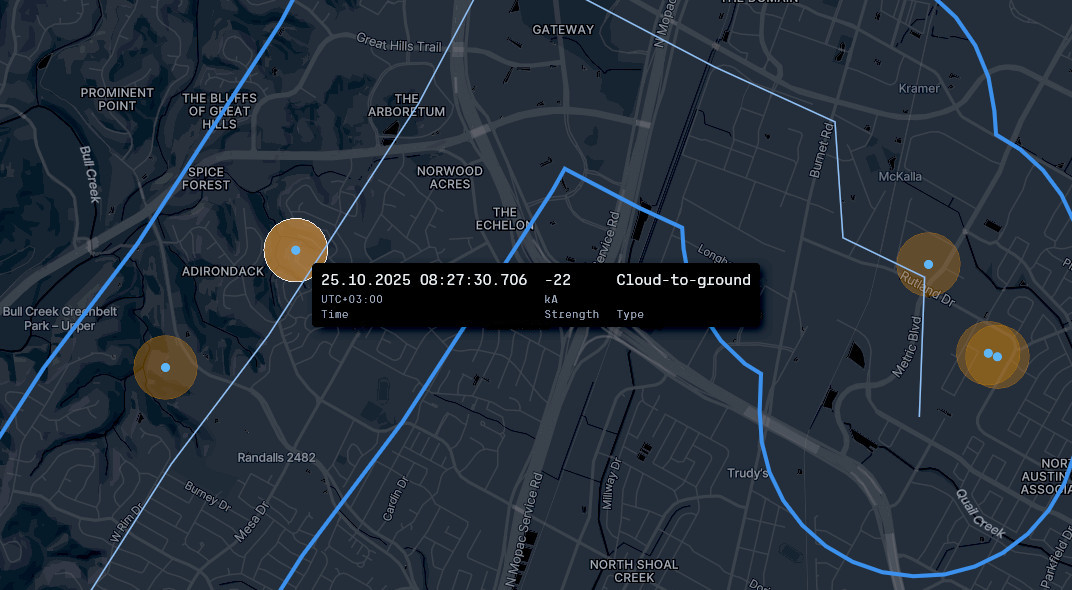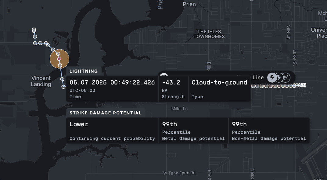 Reports now include strike damage potential ratings for each cloud-to-ground event. This innovation, exclusive to Xweather, identifies strikes with characteristics most likely to cause equipment damage: high peak current, long continuing current, or multiple return strokes.