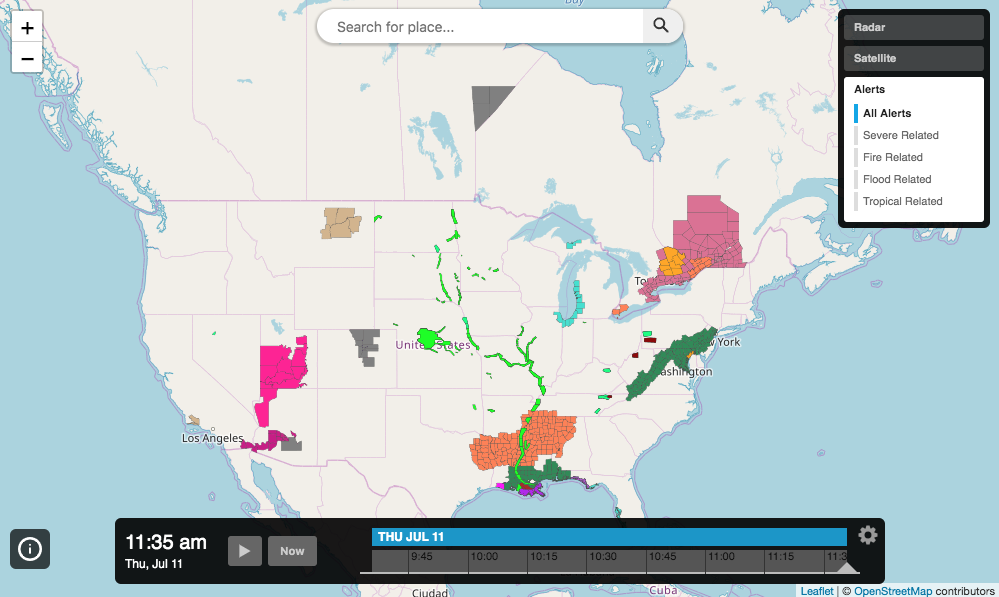The following example will display an interactive map application centered on the United States with radar, satellite and alert layer options. Alerts can be selected to show all alerts or specific categories of alerts only.