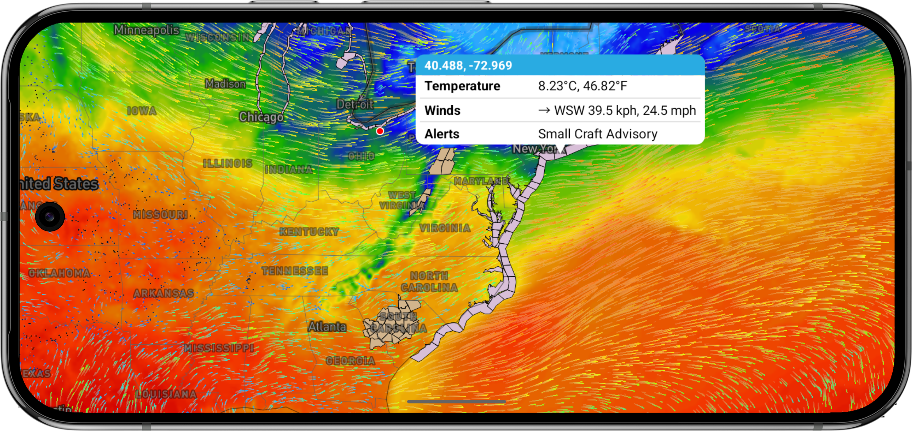 mapController.addWeatherLayer(tempsConfig)Note that for the temperatures layer, the resulting value is a simple float value stored on the value key of the feature's properties. However, some layers consist of multiple values, like those related to winds and other vector data. For these layers, the feature's properties will contain values for both value and angle keys: