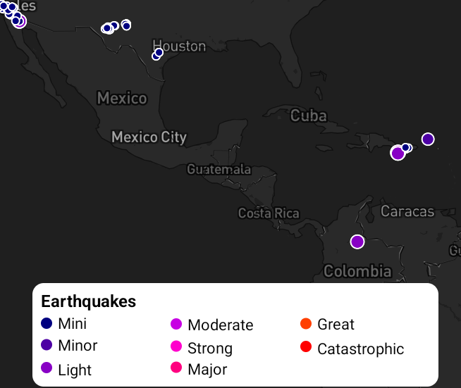 legendView.layoutParams = paramsOnce you're set up a legend control with your map controller, then you're ready to start adding legends. If you're just using our built-in weather layers, then there's nothing else you need to do as the necessary legends will be added and removed along with their respective weather layers. However, if you're using weather layers with custom styling, then you may need to also provide a custom configuration for those legends so that the legend reflects your style overrides. Review the Custom Weather Styling section below.