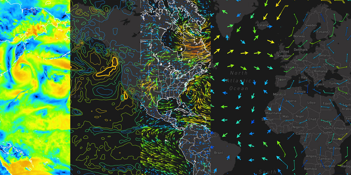 - particle: Renders vector data, such as wind speed or ocean currents, as particle flow fields