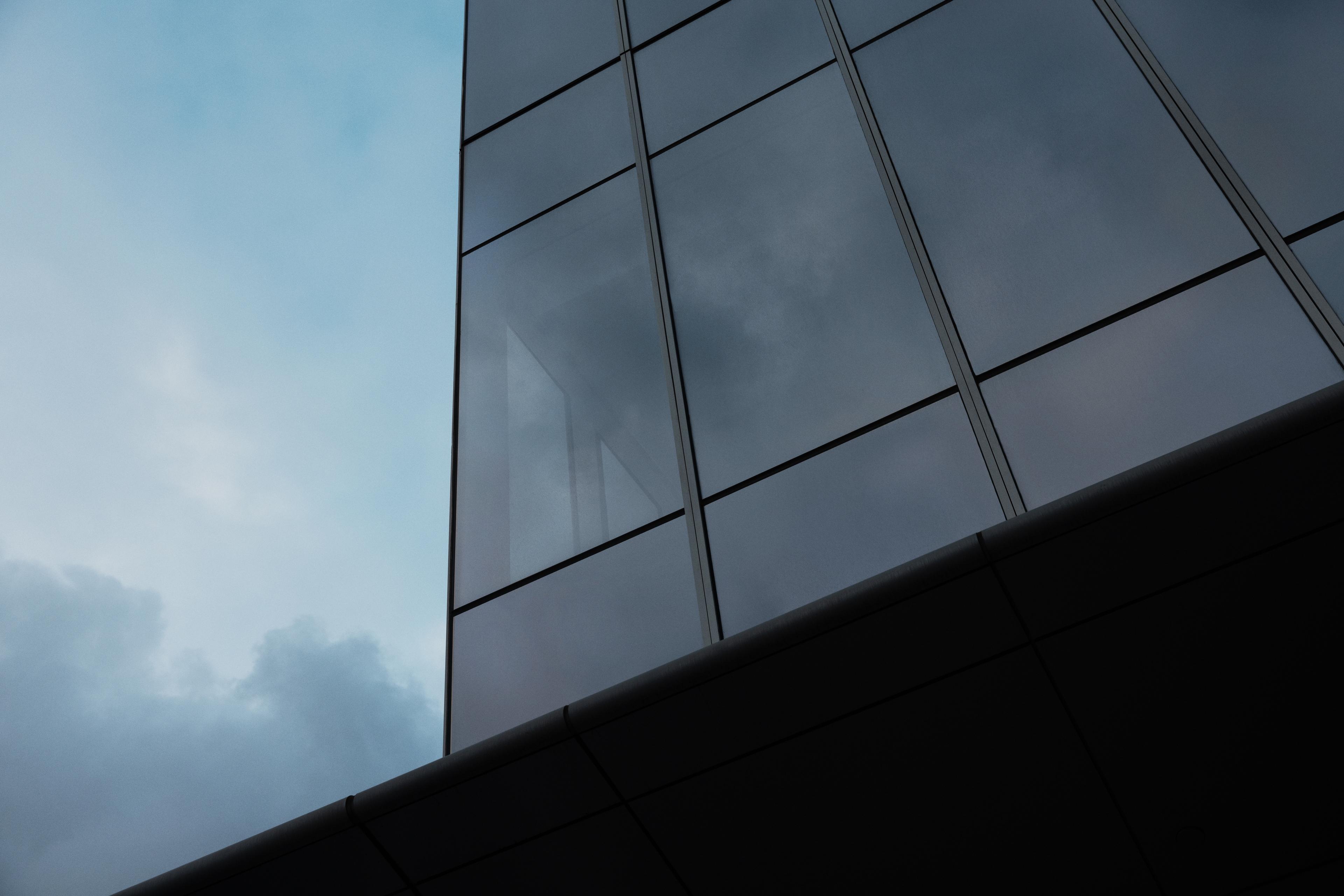A narrow urban alleyway at dusk, framed by tall industrial buildings, with modern skyscrapers visible in the background.