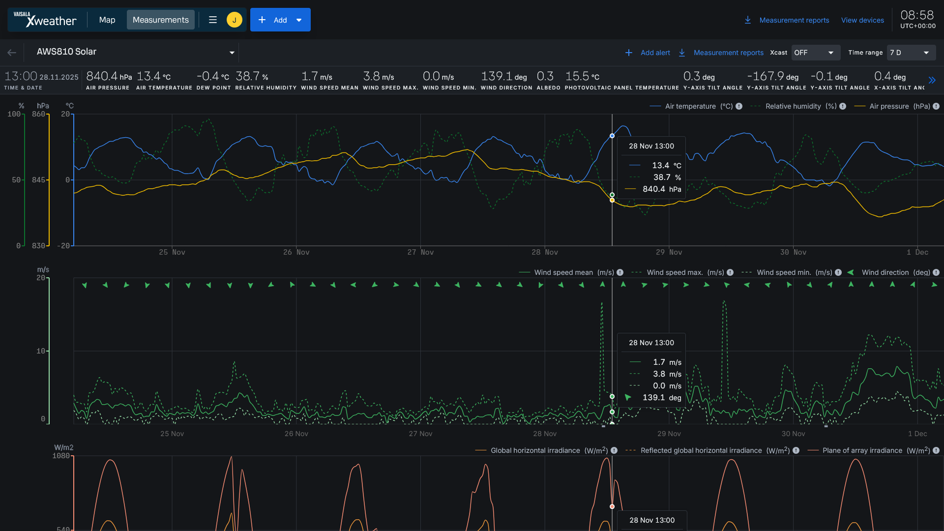 Xweather Insight supports more than 30 weather, environmental, and solar measurement parameters when connected to compatible Vaisala sensors and weather stations. You can find a complete list of parameters, specifications, and supported devices in the Xweather Observe datasheet.